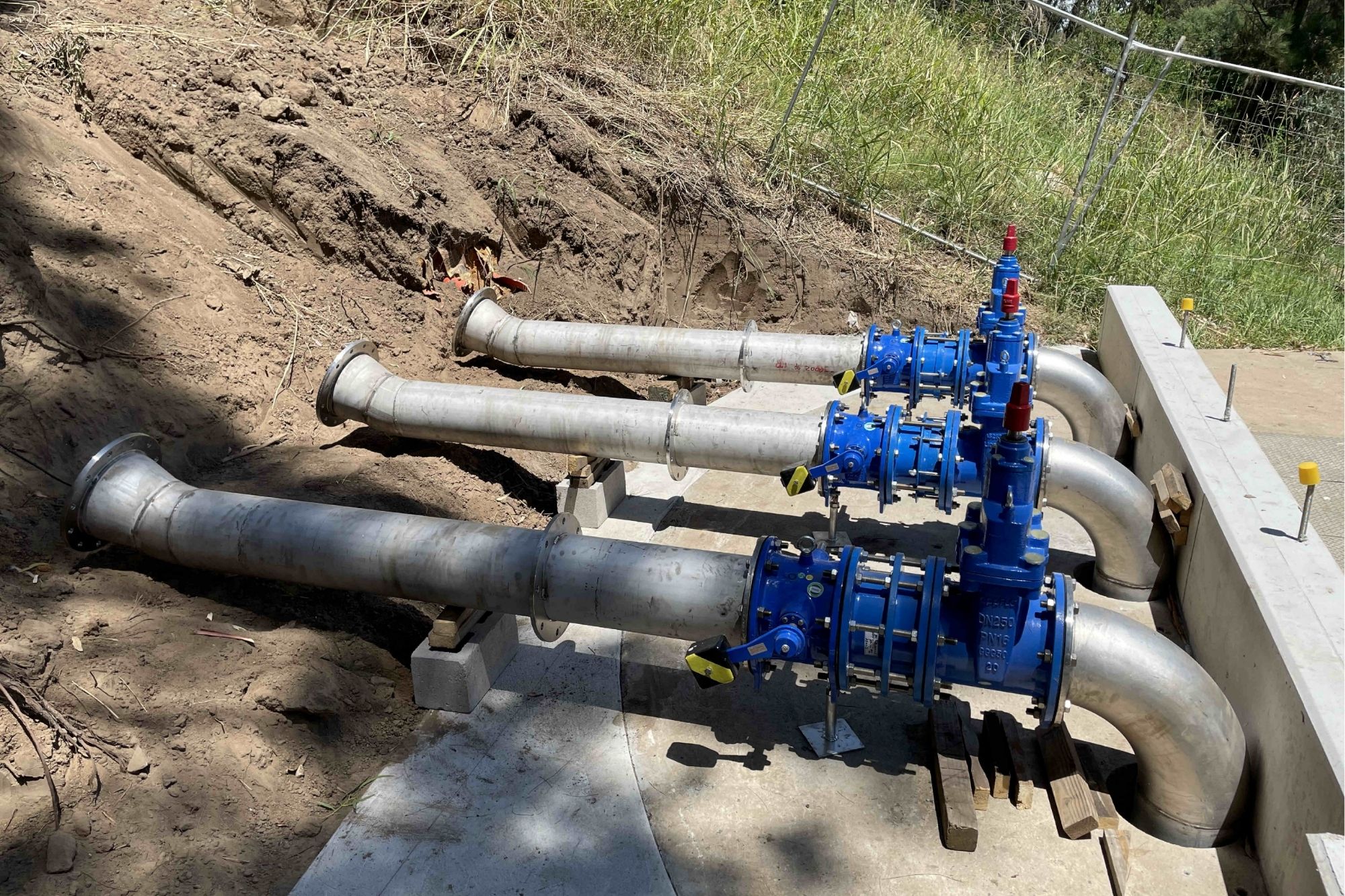 - Gate Valves, Check Valves, and all associated connection fittings to link all the 3 pumps to the existing holding tank via 3 independent 315mm poly discharge lines.